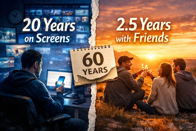 Nur allzu oft haben diese Freundschaften nicht die höchste Priorität. Denn zwischen 6,5 und 11 Stunden pro Tag sind wir auf dem Screen zu Hause. Fernseher. Handy. Laptop. Dagegen treffen sich nur etwa 18 % der Deutschen einmal die Woche für 30–90 Minuten mit ihren Besties, mit denen sie tiefgründige Gespräche führen. Wenn wir das nun gegeneinander aufrechnen und einen Zeitraum von 60 Jahren zugrunde legen, dann warst du 20 Jahre am Bildschirm – und nur 2,5 Jahre in echten Verbindungen. Bravo.